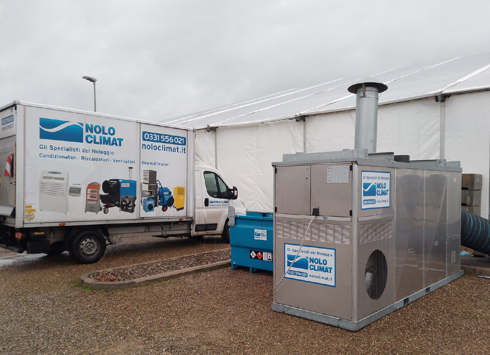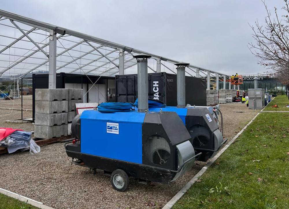 Qualche giorno prima siamo stati chiamati a proporre una soluzione di riscaldamento per la struttura, ed un nostro esperto si è messo subito all’opera per preparare un preventivo. Date le dimensioni e la stagione, ha optato per il noleggio di due riscaldatori Aurora FH4000, due Aurora FH2000, tre FH185, due cisterne per il gasolio da 3000 litri e due da 1000.