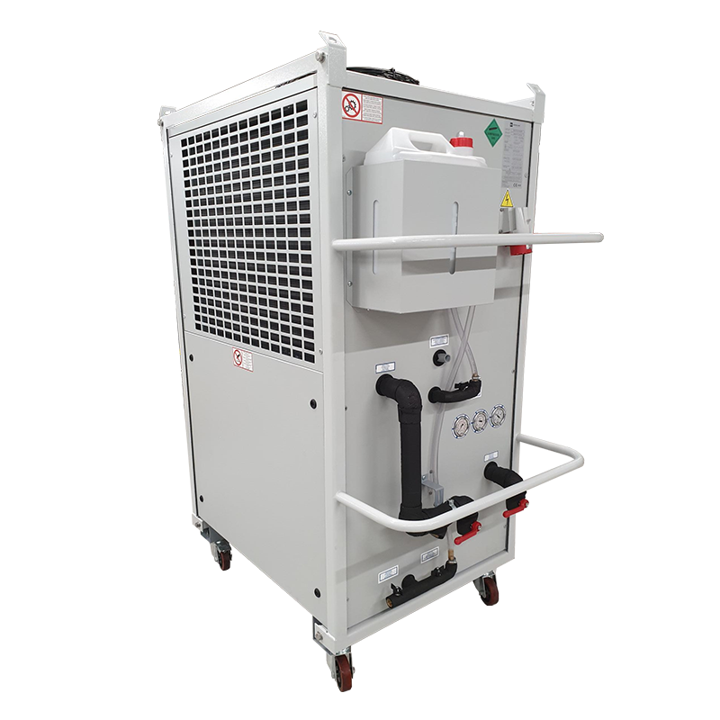 Il 15 kW è un chiller di ultima generazione, utilizzabile in una varietà di applicazioni commerciali e industriali che richiedono acqua refrigerata o climatizzazione. Una volta sul sito basta collegarlo ai sistemi di raffreddamento fissi dei clienti per ottenere immediatamente grandi volumi di acqua fino a -5°C. Se usato in combinazione con unità fan coil – già installate o a noleggio – offre un’alta capacità di condizionamento dell’aria. La struttura compatta e le ruote integrate lo rendono facile da spostare e installare. Questo chiller fa parte di una gamma di apparecchiature in grado di soddisfare tutte le esigenze di raffreddamento e di controllo della temperatura.